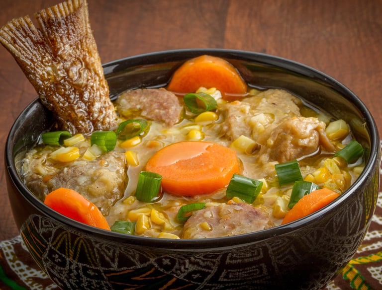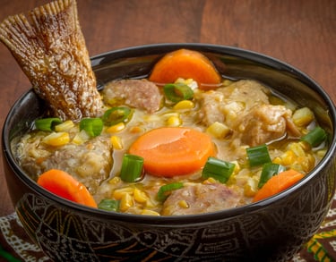 Sopa de legumes com milho, pedaços de galinha, carne de boi, linguiça e peixe.