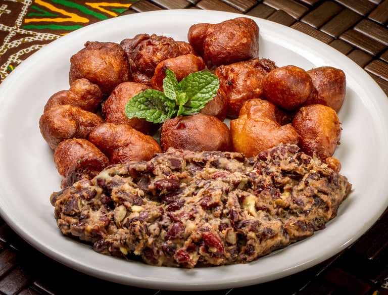 Bolinho de chuva com feijão e mingau de milho com tamarindo.