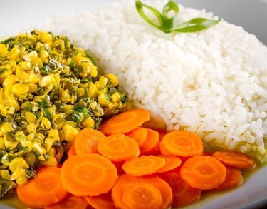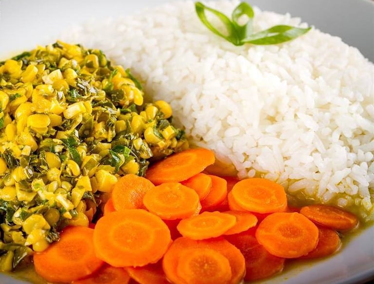 Milho refogado com azeite de dendê e couve, arroz e cenouras cozidas.