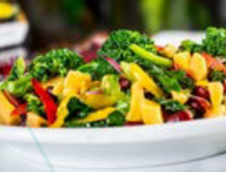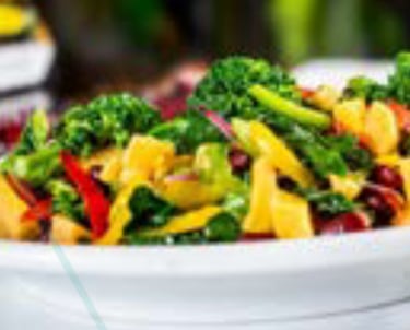 Salada de banana da terra cozida, brócolis, feijão vermelho, tomate cebola e pimentão.