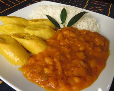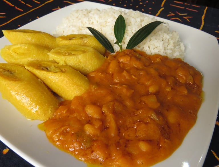 Feijão branco com azeite de dendê, arroz e banana cozida.