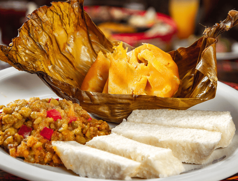 Bolo de feijão fradinho com azeite de dendê, ervilha refogadas e inhame cozido.