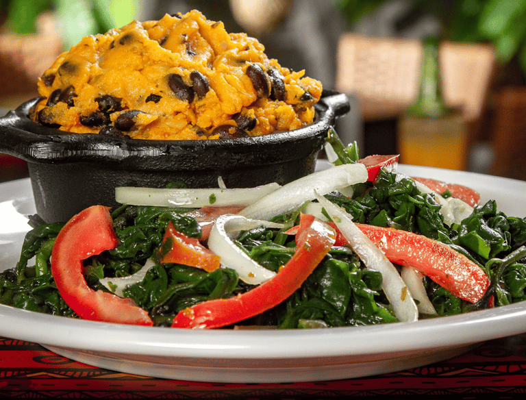 Batata amassada, feijão preto, azeite de dendê, acompanha salada de espinafre.